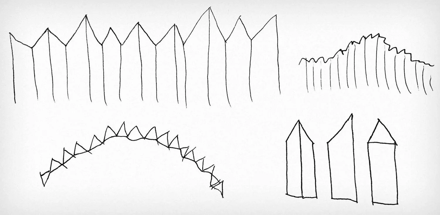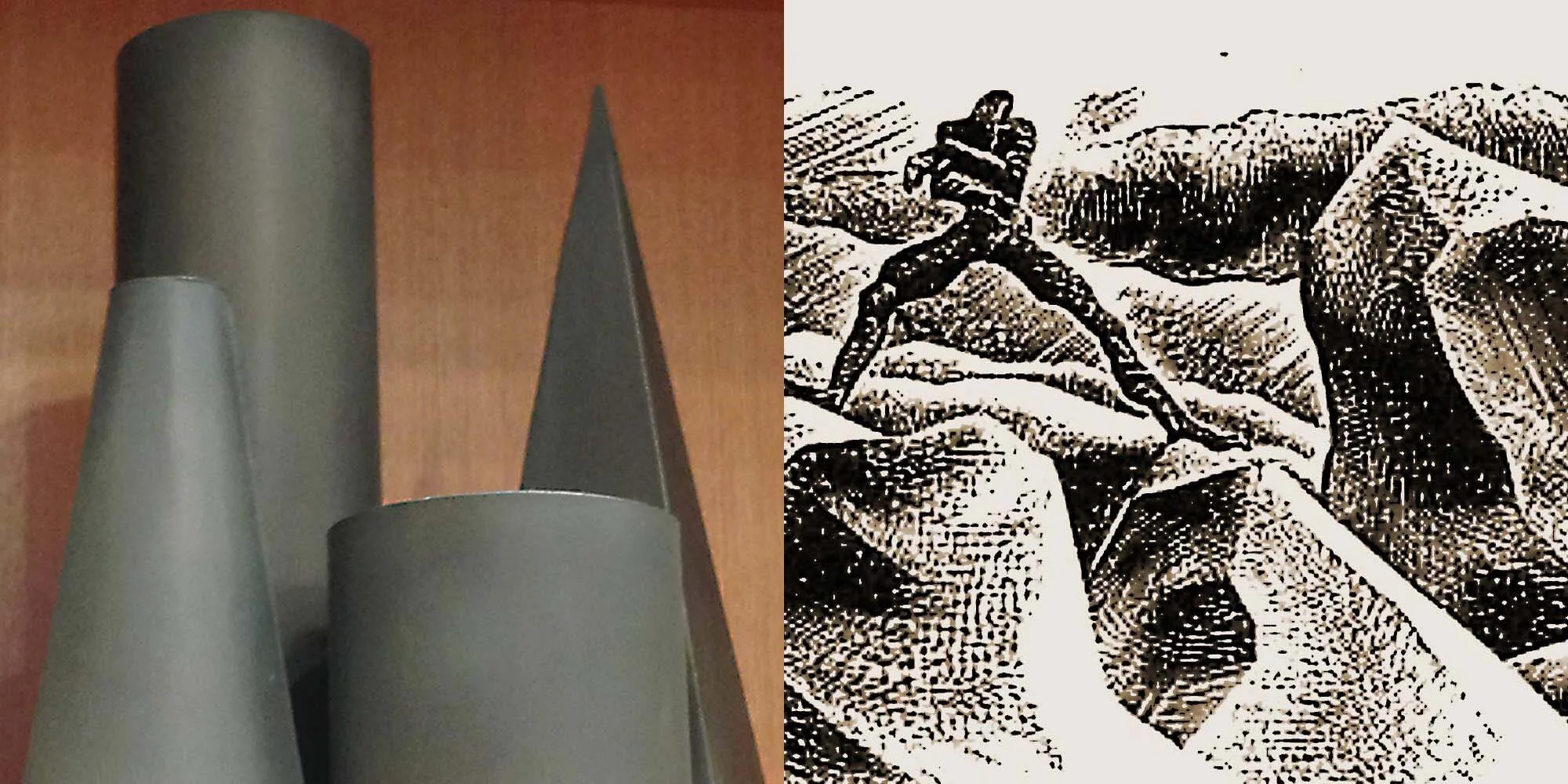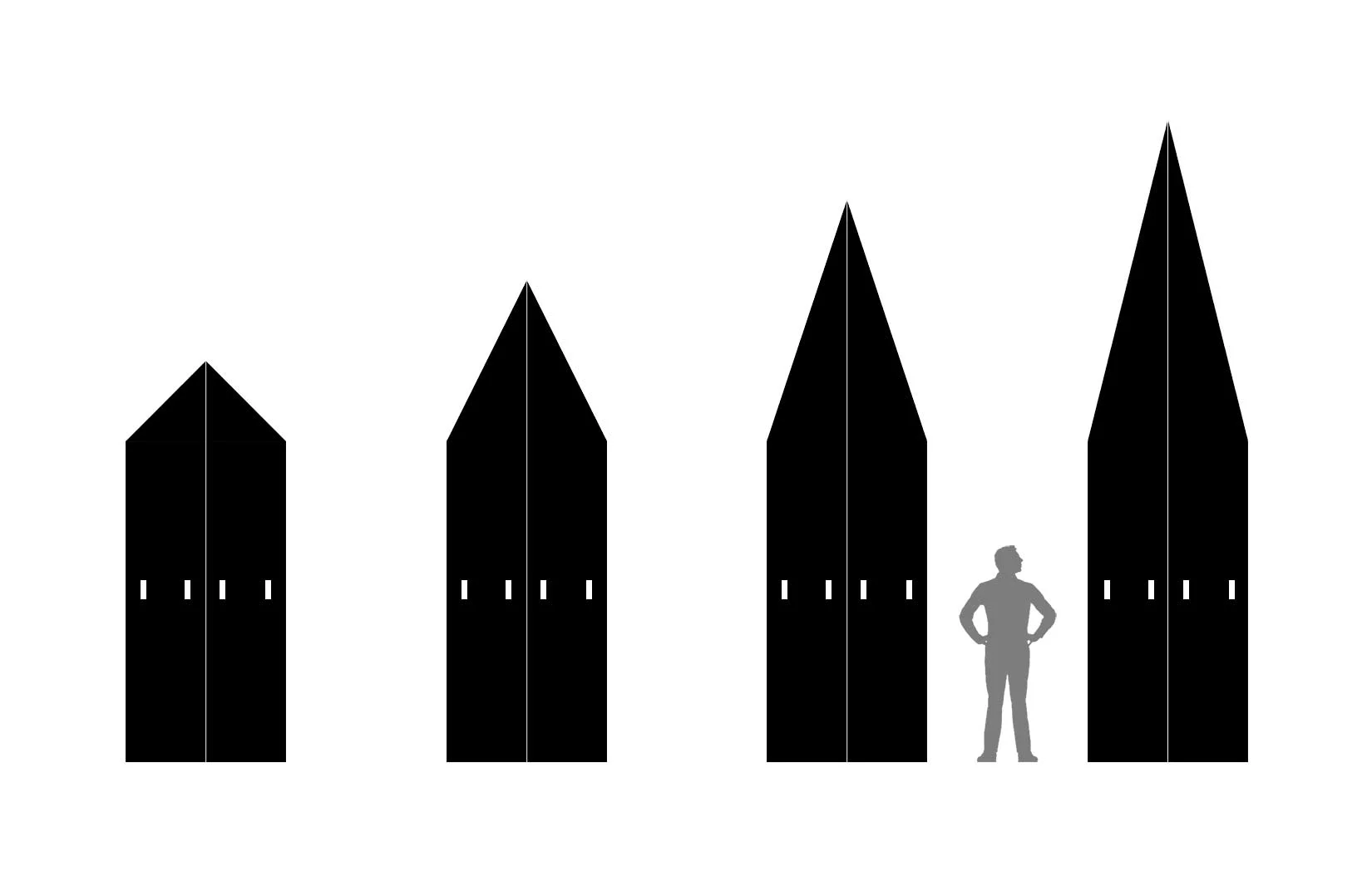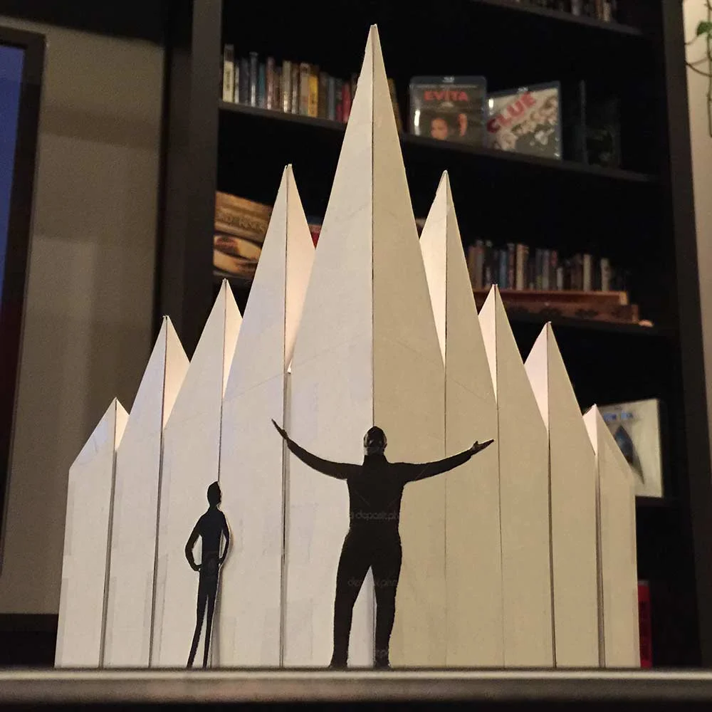 Instead of flat tops as is tradition, my periaktoi would feature pitched roofs and come in four different heights, 10’, 12’, 14’, and 16’ to further play up the electronic inspiration and also give the production more geographic diversity. They would also feature handles so that actors could not just rotate them 360˚ in place, but pilot them around the stage throughout the show in any direction during transitions, arranging them into changing formations for different scenes and settings. Lastly, I wanted them painted a flat grey which further played up the Brutalist angle and had the added benefit of taking lighting and texture very well.