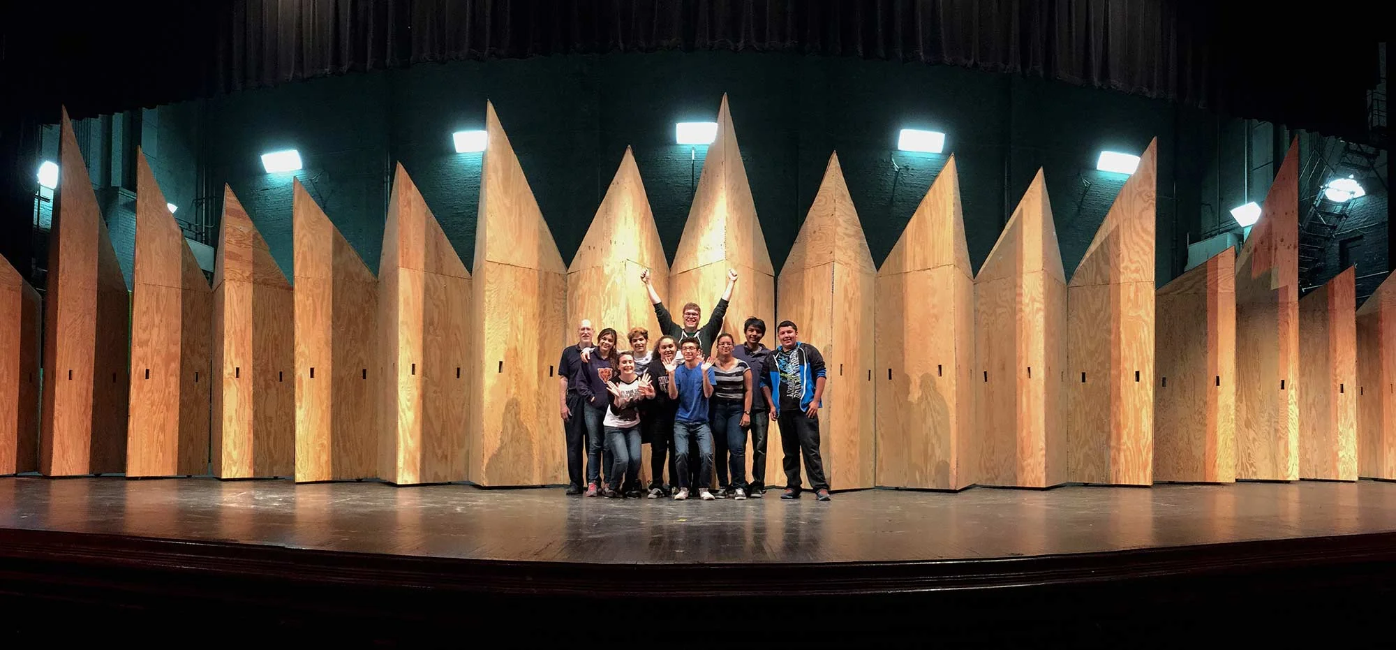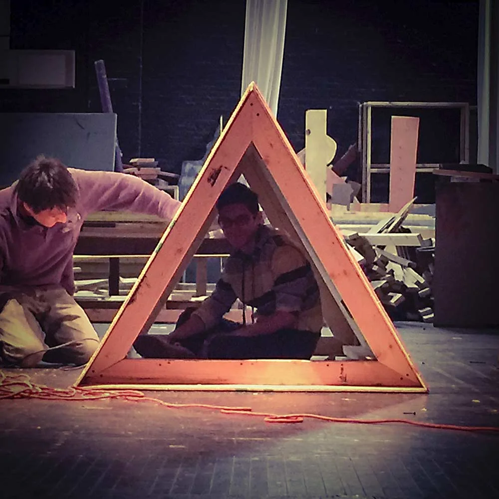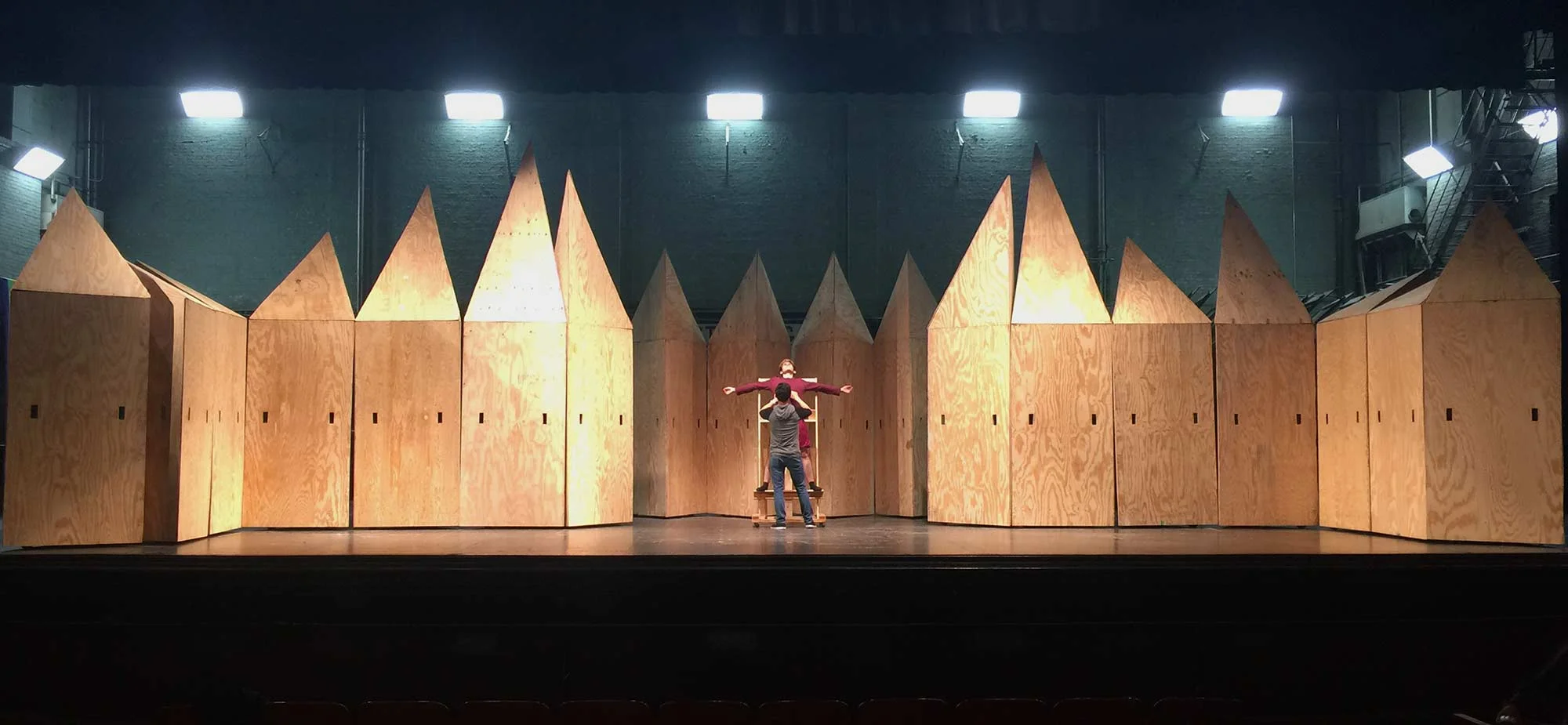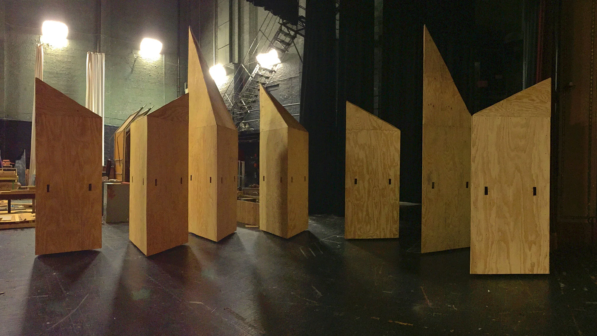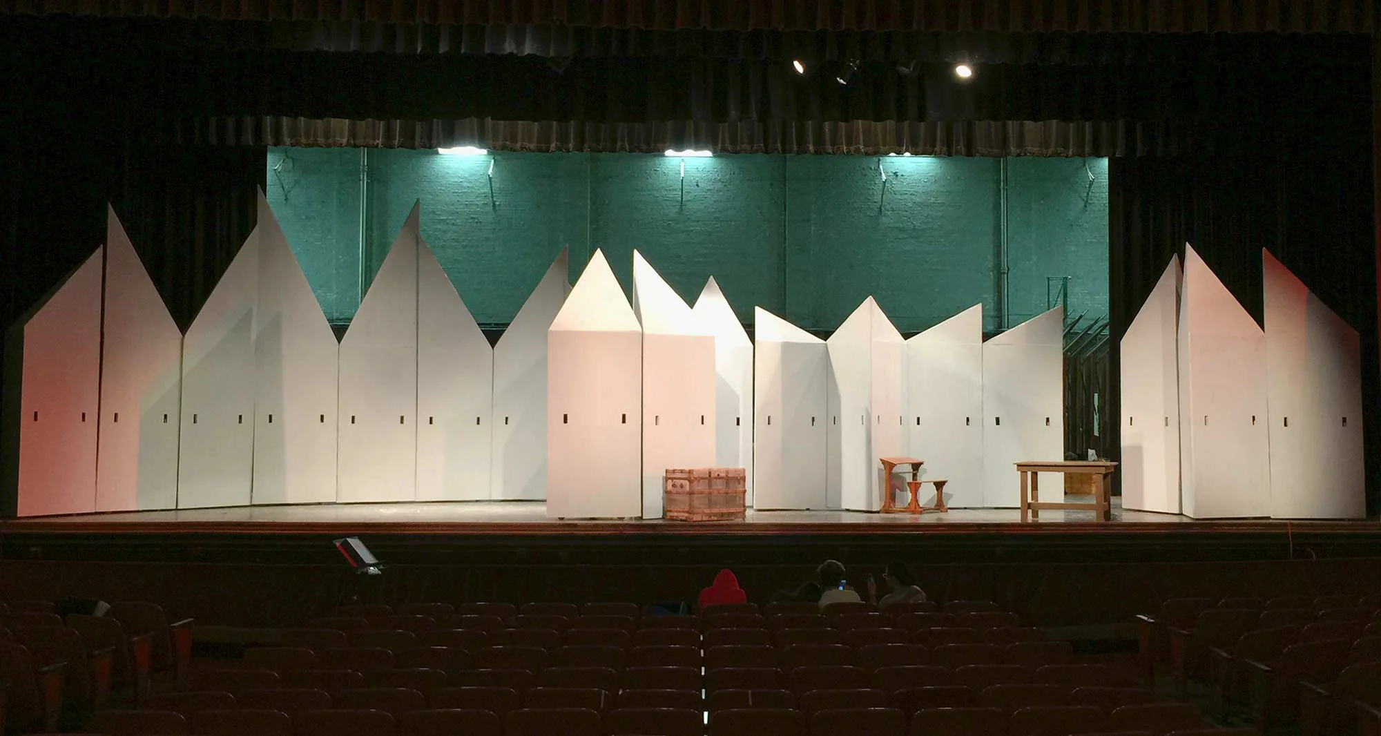 The next step was deciding on formations that would signify settings throughout the show. I made a paper model to speed up the process and help the cast and crew to visualize and buy-in to the concept. Once the formations were finalized they were marked on stage with spike tape in corresponding colors with an additional mark on a corner signaling to the actor or crew member which direction to point the highest corner of their periaktos. We rehearsed these formations for weeks timing them and getting the transitions down to a much brisker pace than I ever envisioned. The final effect on stage was compared to a “ballet” by some audience members as you watched one scene split apart and another form in its place on stage.