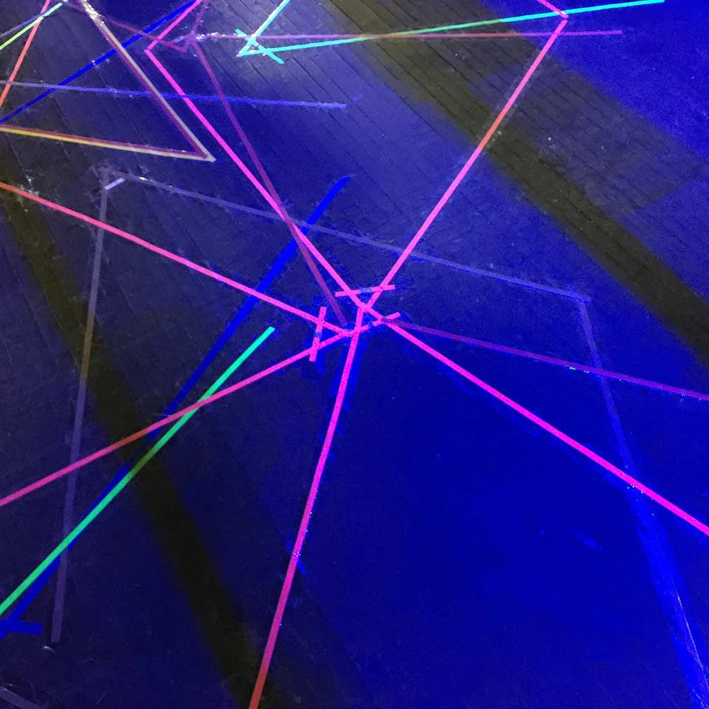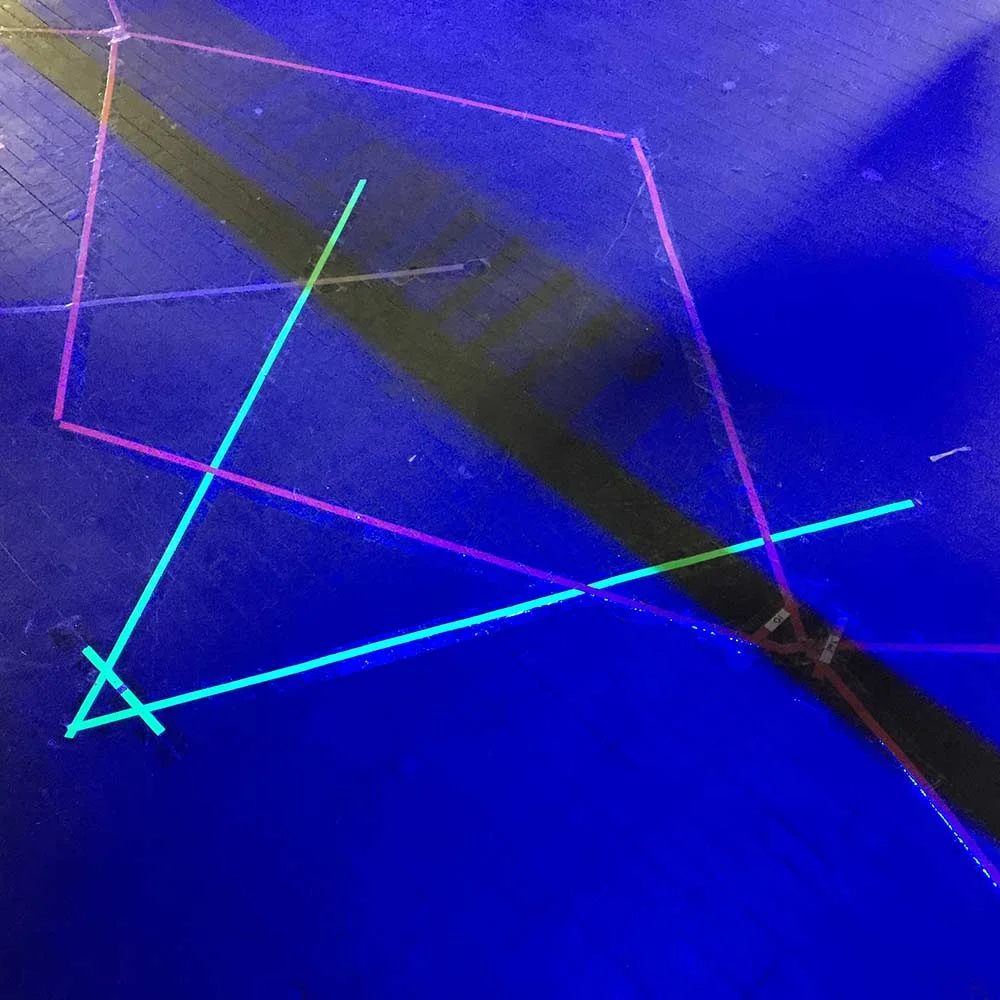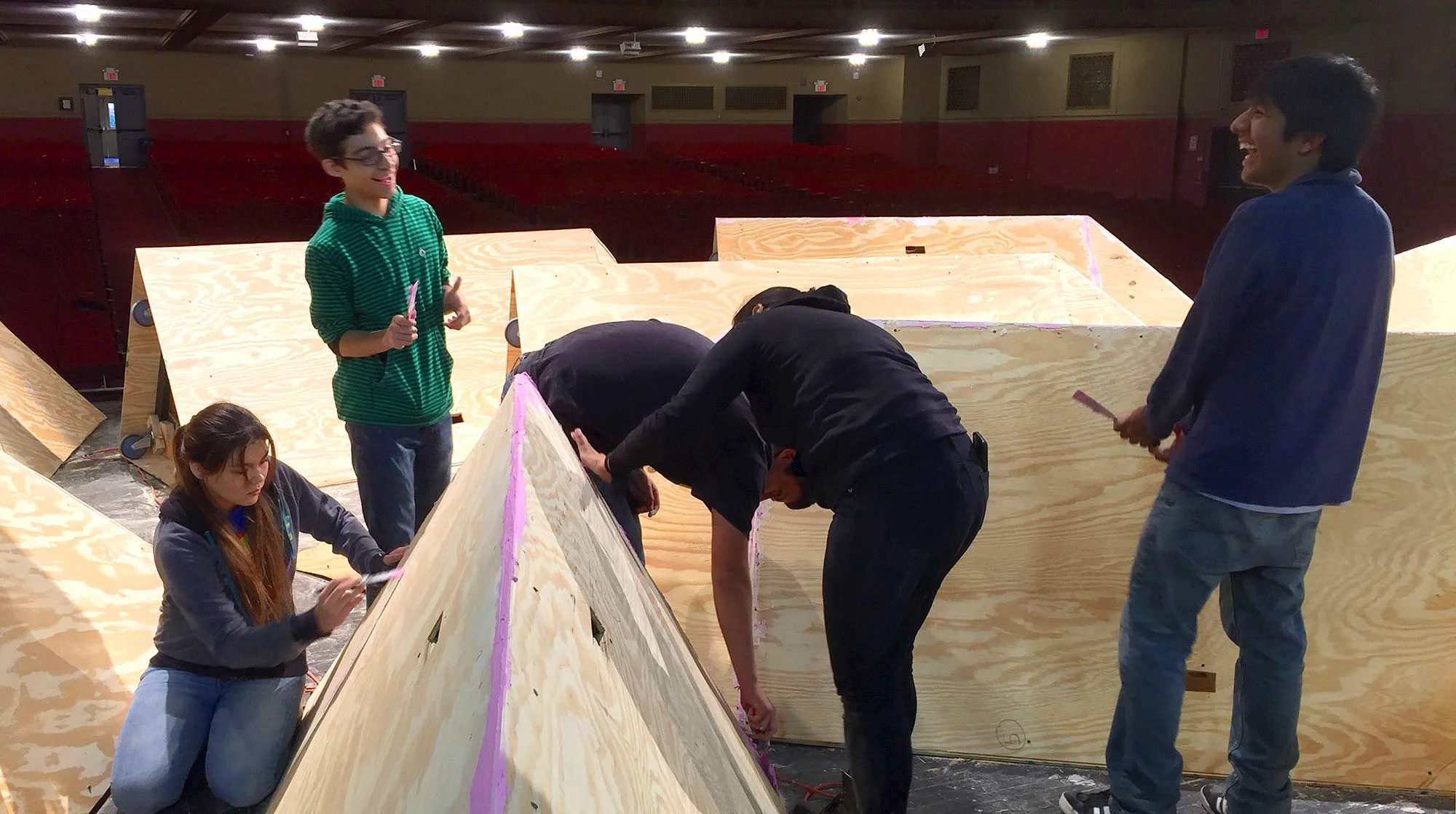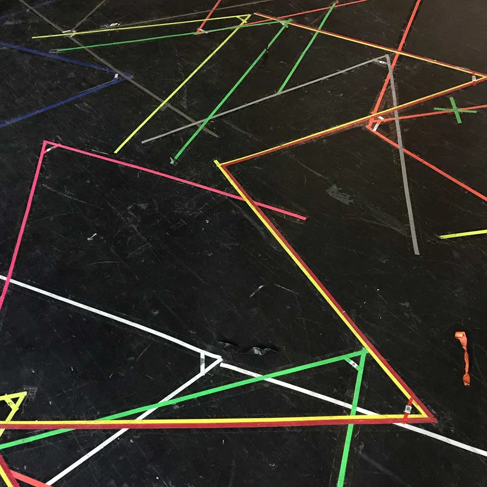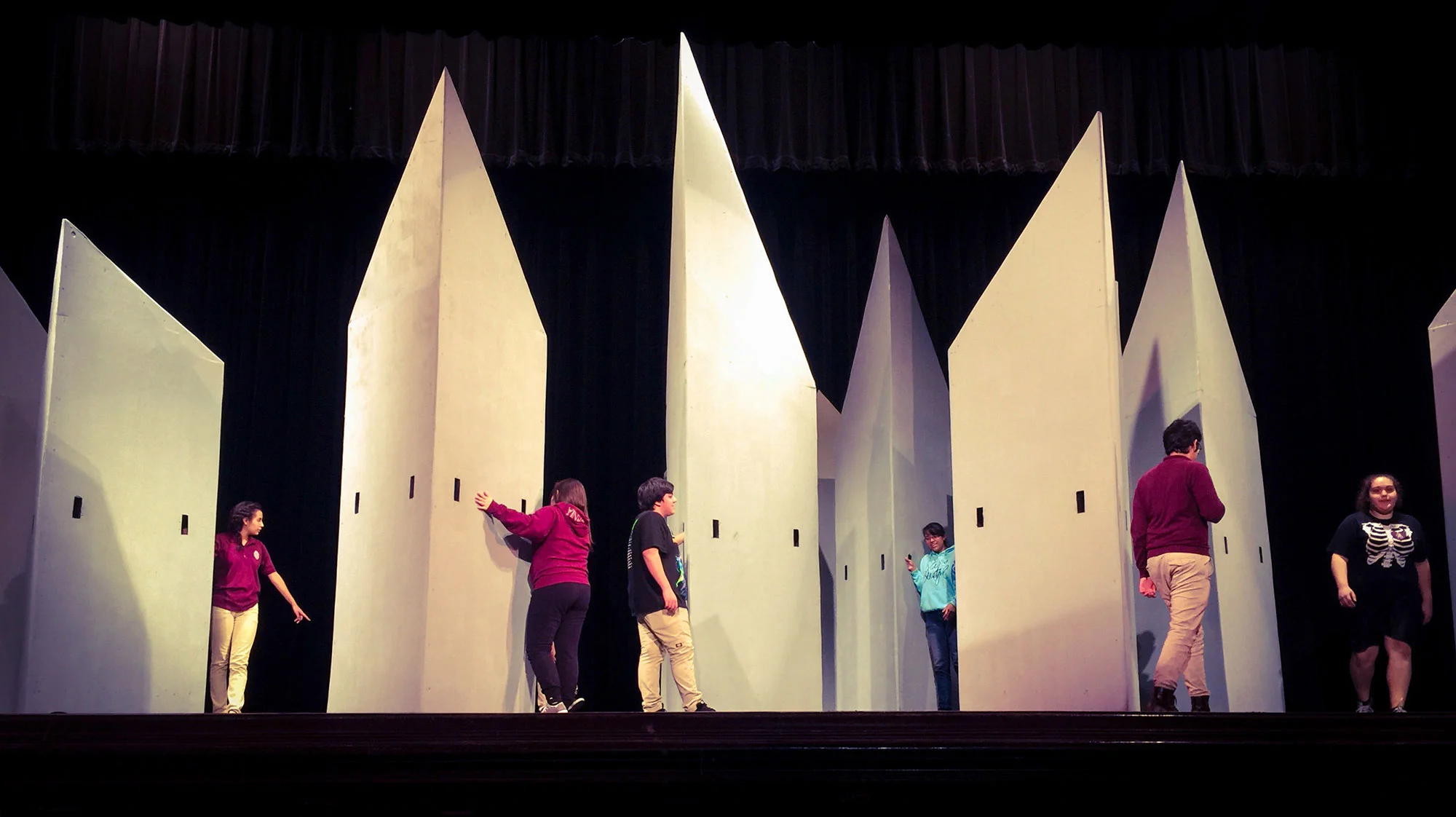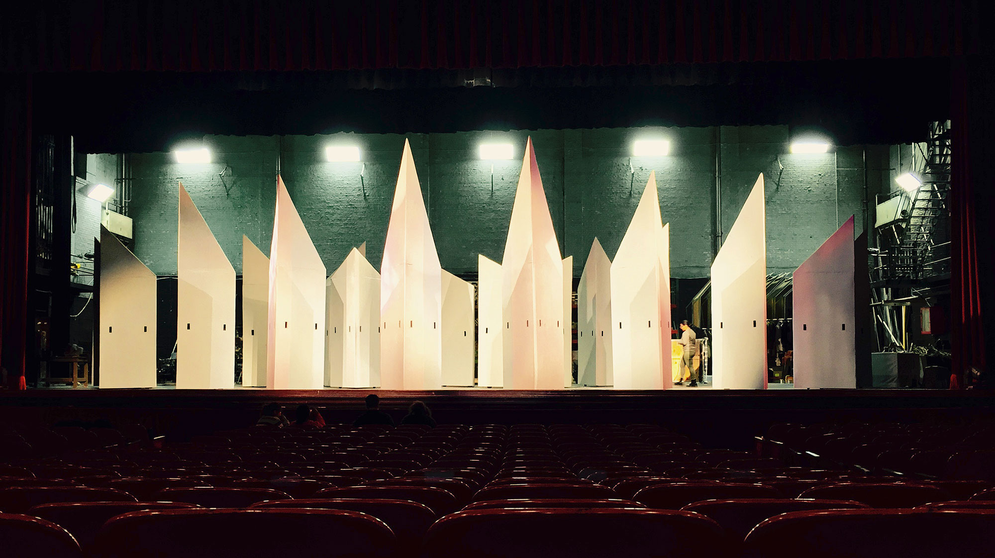 The next step was deciding on formations that would signify settings throughout the show. I made a paper model to speed up the process and help the cast and crew to visualize and buy-in to the concept. Once the formations were finalized they were marked on stage with spike tape in corresponding colors with an additional mark on a corner signaling to the actor or crew member which direction to point the highest corner of their periaktos. We rehearsed these formations for weeks timing them and getting the transitions down to a much brisker pace than I ever envisioned. The final effect on stage was compared to a “ballet” by some audience members as you watched one scene split apart and another form in its place on stage.